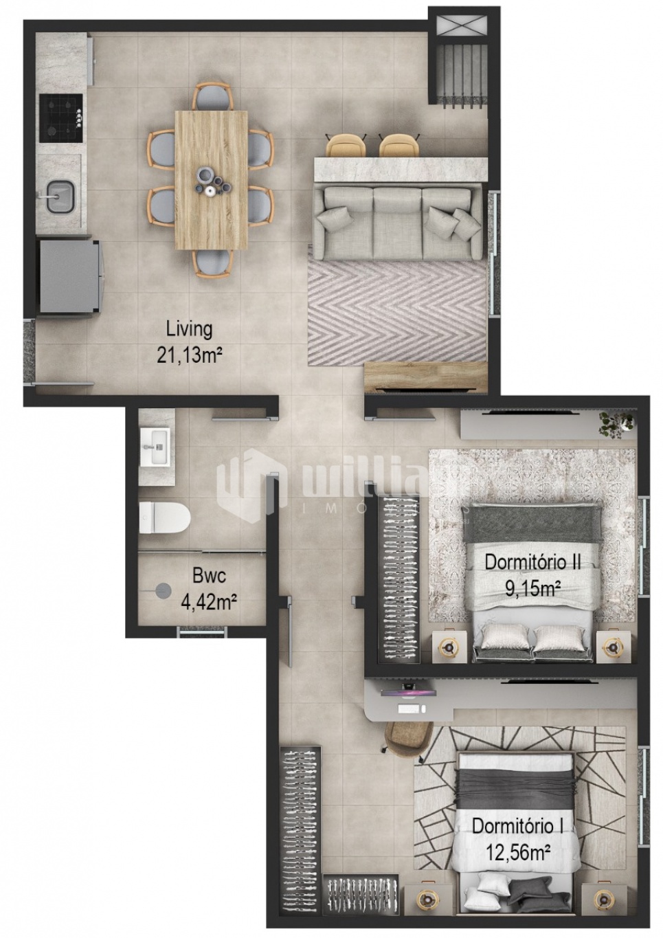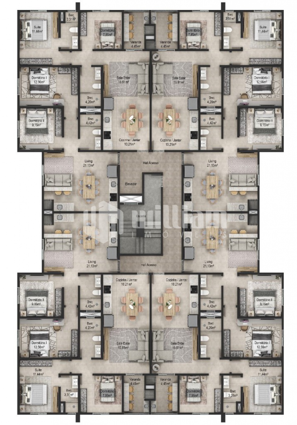 Apartamentos com dois dormitórios, sendo uma suíte, e apartamento de dois dormitórios. Todos os apartamentos possuem churrasqueira a carvão, living integrado e banheiro social. Cada um unidade possuí uma vaga de estacionamento externa.