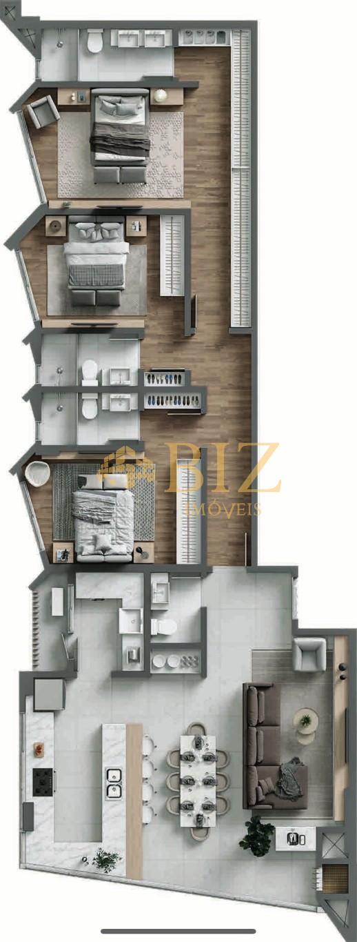 Apartamento tipo 1, com 140,95m² de área privativa, sendo 03 suítes com janelas balcão e todas viradas para o mar, com um ângulo de 30º, possibilitando uma maior visão da orla da praia de Balneário Piçarras! Um amplo living com sala de estar, jantar e cozinha, além de 2 vagas de garagem individuais (autônomas) e privativas, além de um hobby box (depósito). Ou seja, é perfeito!