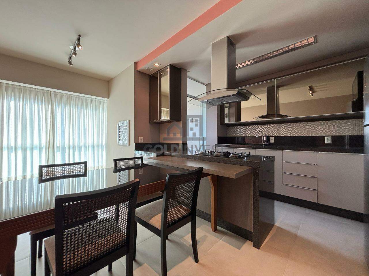 O apartamento conta com 107m² privativos, amplo living onde tem a sala de tv, cozinha, sacada integrada com churrasqueira, lavanderia e lavabo.