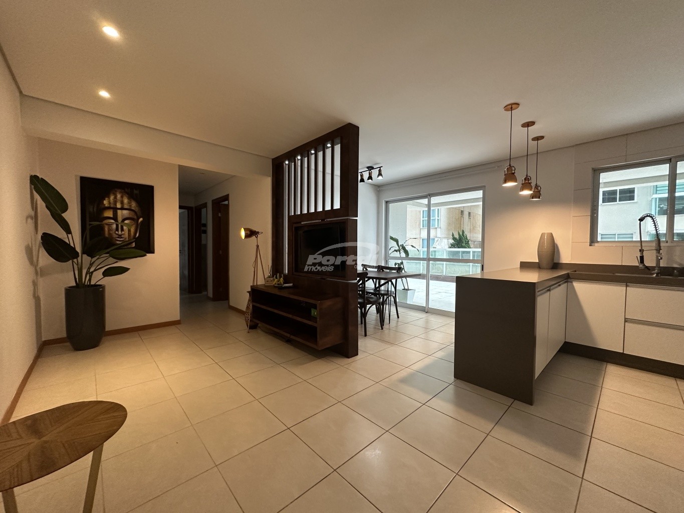 Apartamento de aproximadamente 100m² possuindo 03 dormitórios sendo 01 suíte, sala de estar e sala de jantar conjugadas, cozinha com churrasqueira, giardino com ofurô e vista mar, área de serviço e 02 vagas de garagem.