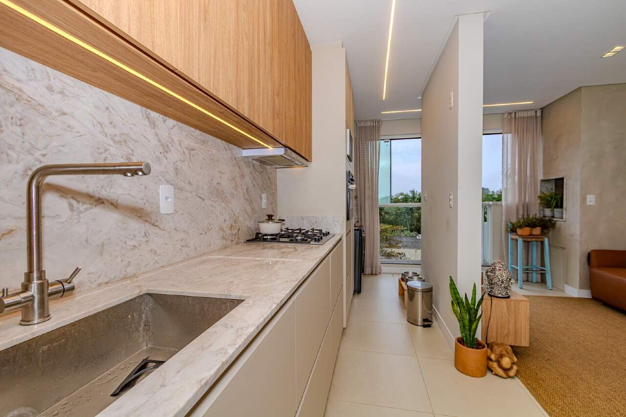 O living integrado garante amplitude e luminosidade, unindo sala de estar, sala de jantar e cozinha em um ambiente aconchegante e acolhedor.