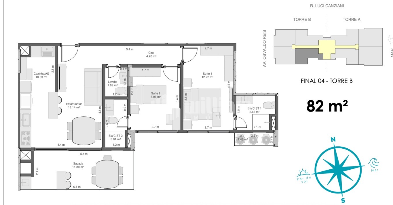 O apartamento possui 82m2 muito bem distribuídos em: