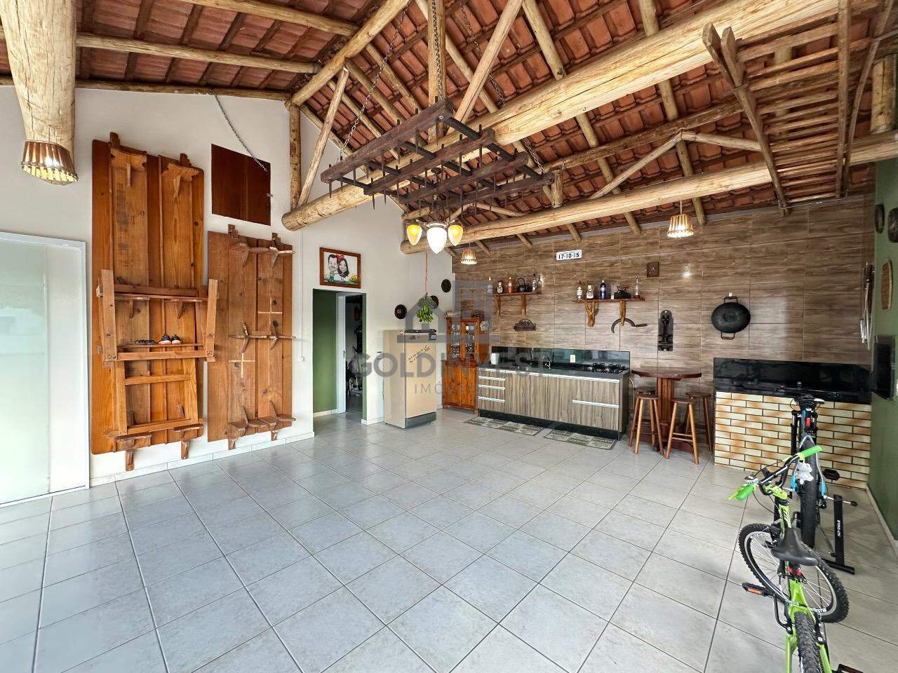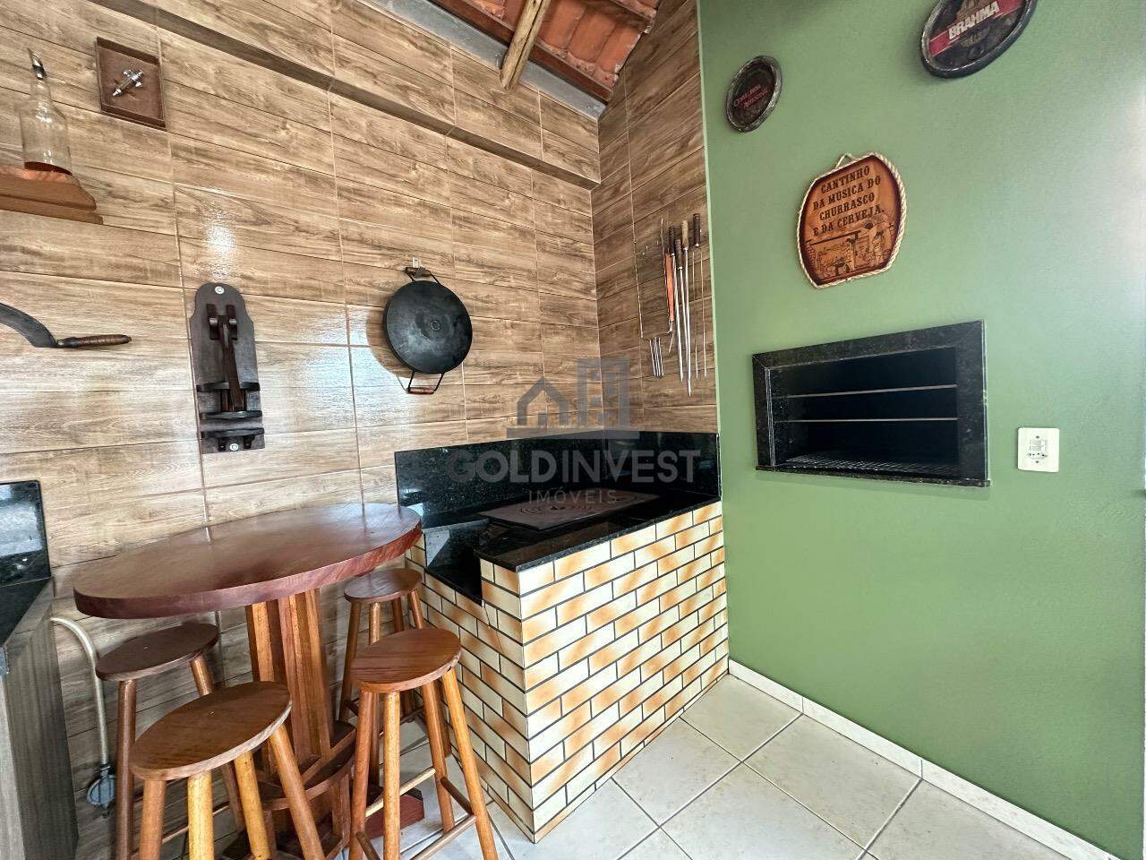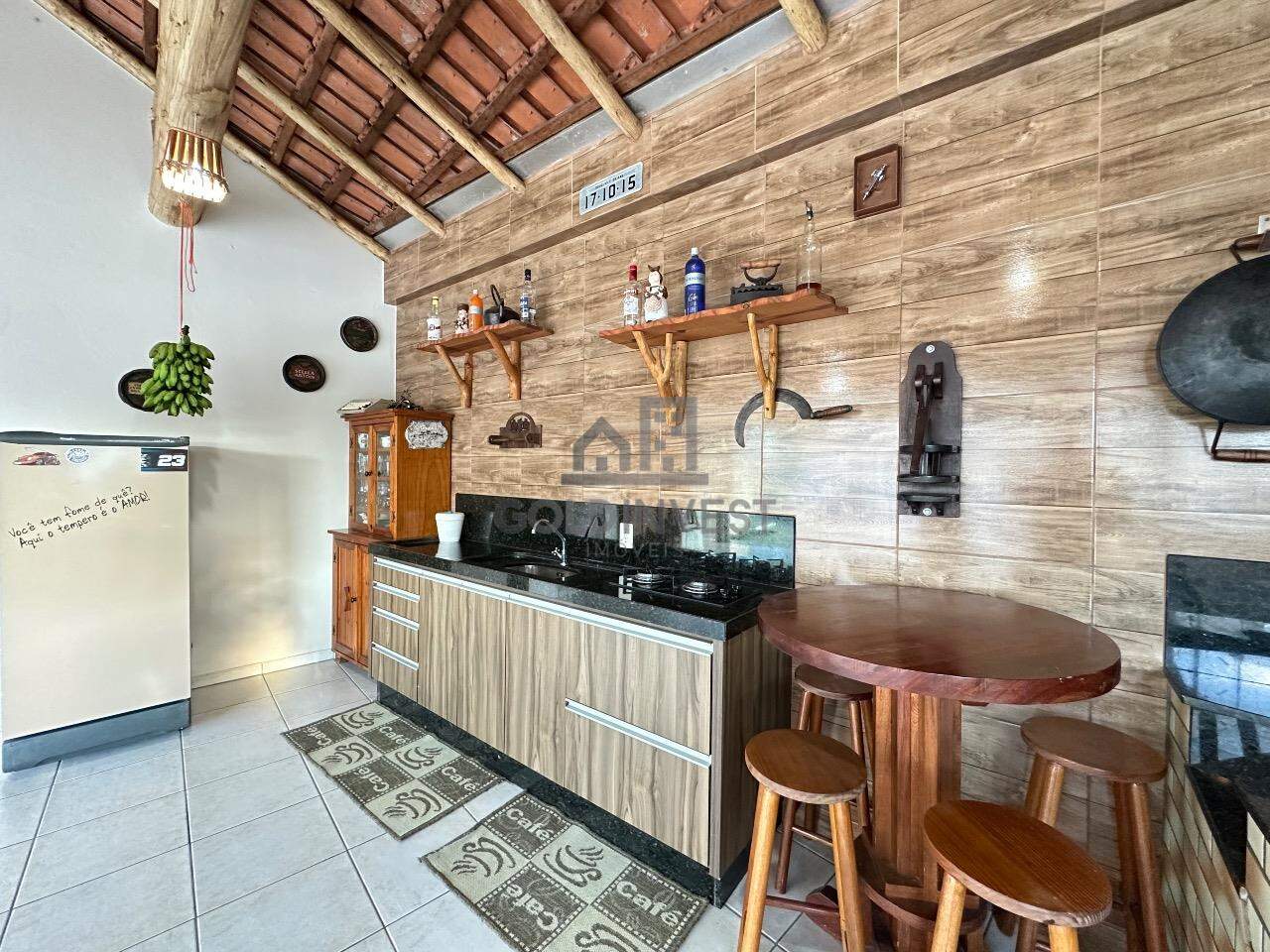 Possui na parte de trás da casa uma ampla área de festas com churrasqueira, fogão a lenha, banheiro e garagem para 2 carros.